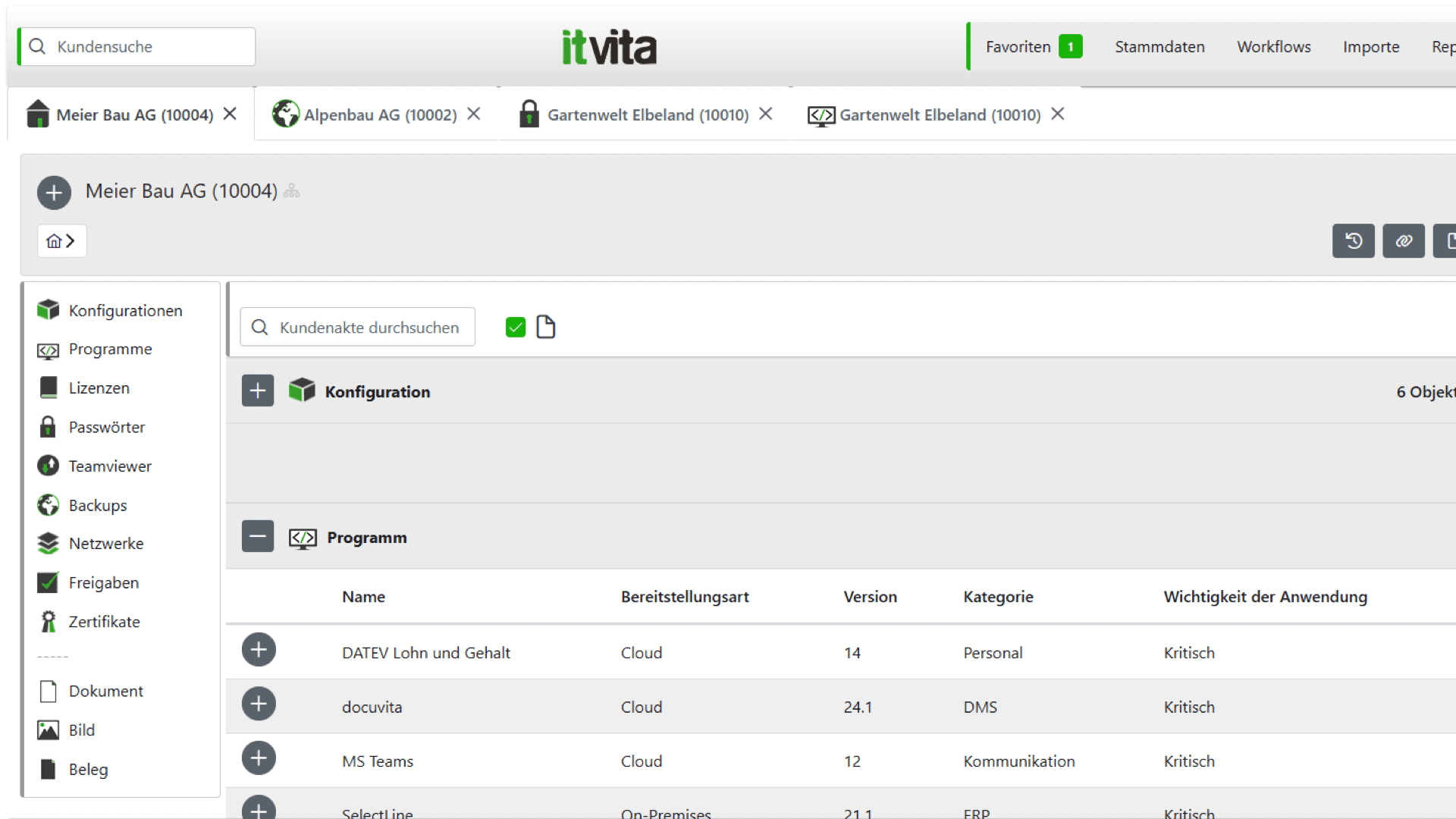 itivta bietet eine sichere Lösung zur Verwaltung von IT-Kundendokumentationen wie Passwörter, Infrastrukturdaten und Lizenzen. Die benutzerfreundliche Oberfläche erleichtert die Dokumentation, basierend auf dem bewährten DMS docuvita. Automatisierungen und Schnittstellen zu IT-Verwaltungslösungen sorgen für eine zeitsparende und übersichtliche Arbeitsweise.