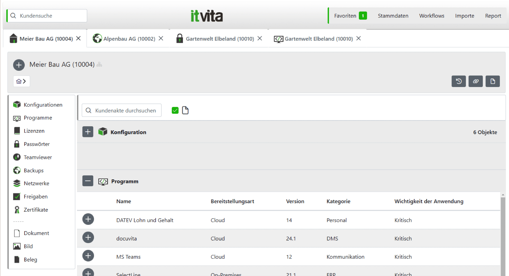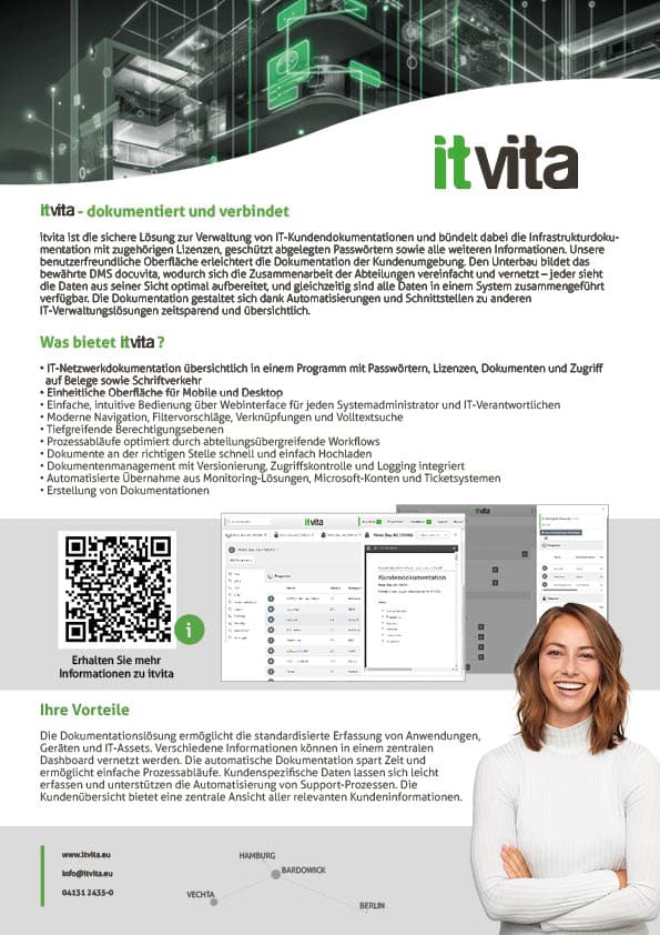 itivta bietet eine sichere Lösung zur Verwaltung von IT-Kundendokumentationen wie Passwörter, Infrastrukturdaten und Lizenzen. Die benutzerfreundliche Oberfläche erleichtert die Dokumentation, basierend auf dem bewährten DMS docuvita. Automatisierungen und Schnittstellen zu IT-Verwaltungslösungen sorgen für eine zeitsparende und übersichtliche Arbeitsweise.